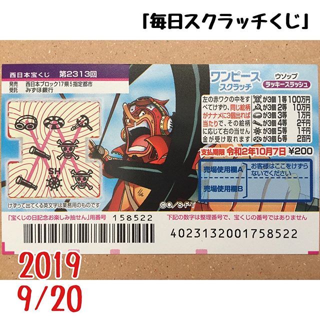 スクラッチで10万円当てた私が見つけちゃった意外な3つの法則を教えます yume577yh 19年1月10日 / 年4月30日 スクラッチってどうしても運次第なところが多い宝くじですが、何か当たる法則さえ見つけられれば、もしかしたら大きな金額をゲットできるかもしれませんね! (ちなみに今回紹介 9月15日~10月12日 ワンピーススクラッチ ロビン3 カウントチャレンジ 単価:1枚0円 ブロック別スクラッチ 1等30万円が25万分の1のスクラッチです。末等0円に極端に配分です! 詳細は9月の記事を参照してください。 9月29日~11月30日 8ラインスクラッチ4 タテ・ヨコ・ナナメ 単価:1枚0円 第3,000万円×1本 単価 0円 抽せん日 令和4年2月4日(金) 当選番号 詳細はコチラ 発売終了まであと 日 第910回 全国自治宝くじ ワンピーススクラッチ 発売期間 令和4年1月12日(水)~令和4年2月8日(火) 1等当せん金×本数 300万円×9本 単価 0円 当選番号 詳細はコチラ 発売終了まであと 日